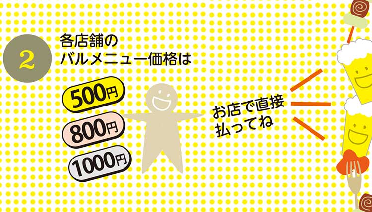 お店では「バルメニュー」(特別メニュー + ワンドリンク)を500円、800円、1,000円のいずれかの価格で提供しています。